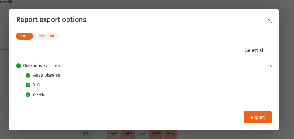 You can export the Compare Questions Report in the following formats: Excel and PowerPoint. The export will contain the category and question scores, broken down by survey.