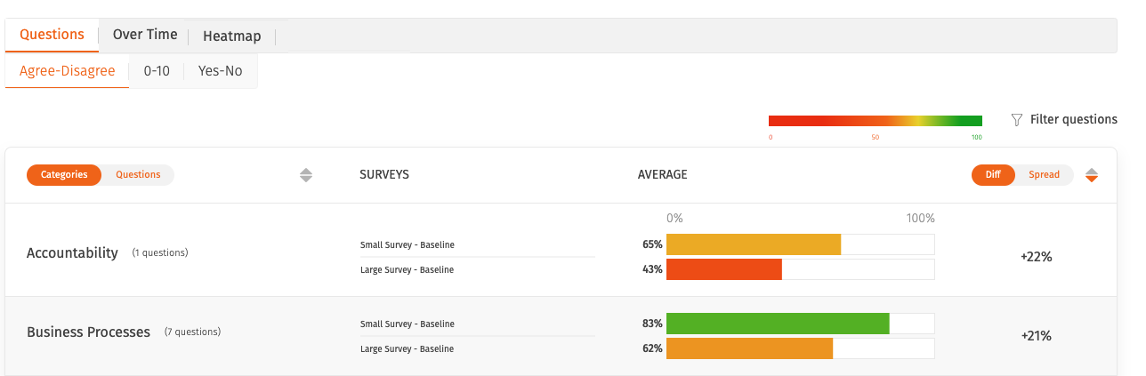 - Spread: This is the highest score minus the lowest. This uses the surveys' average score and shows the spread of the average scores across all surveys being compared.