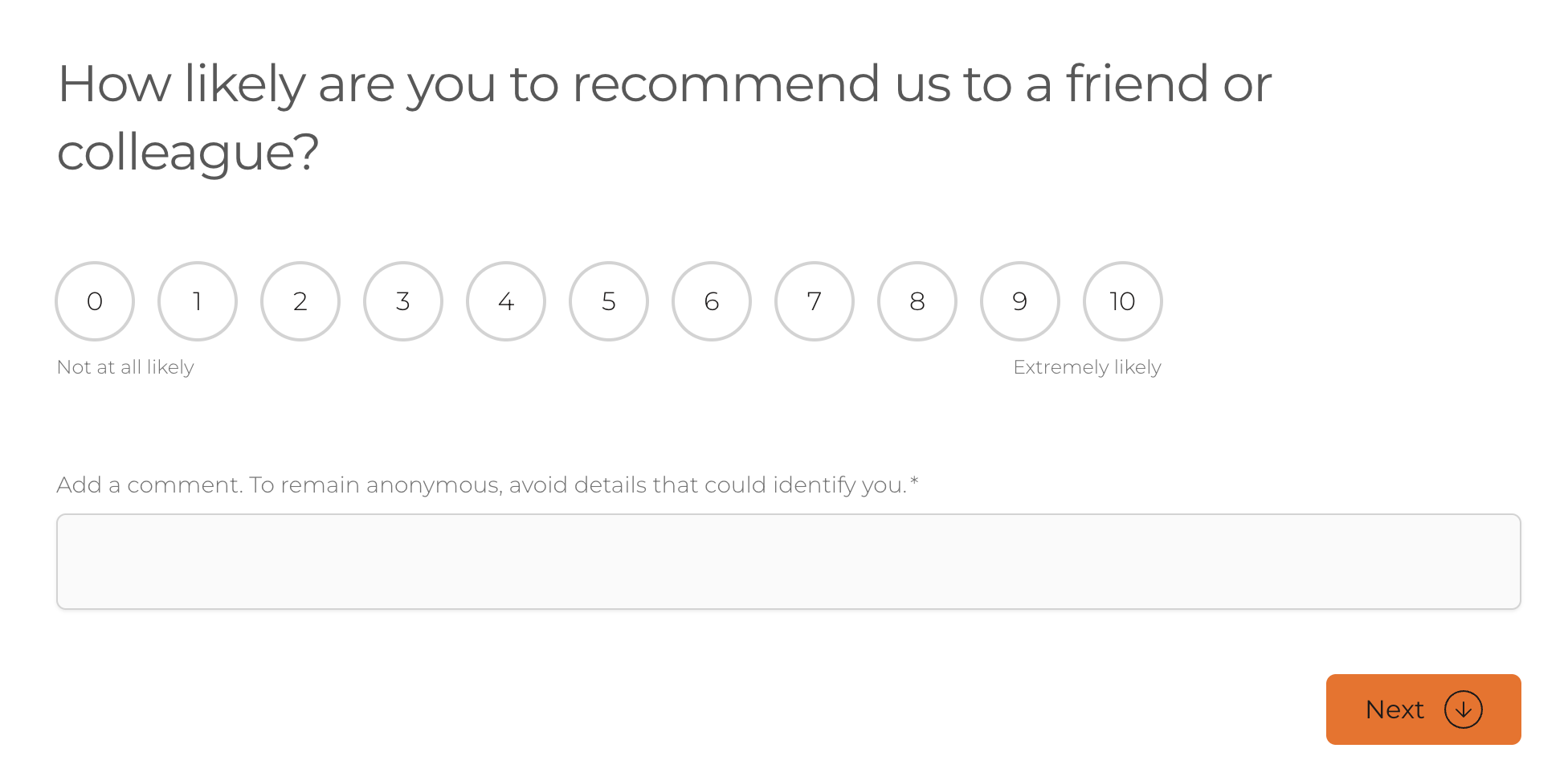 A comment box is shown underneath the rating so respondents can tell you why they chose their score. Comments are enabled by default, and we recommend leaving them on — the comments are where the real insight lives.
