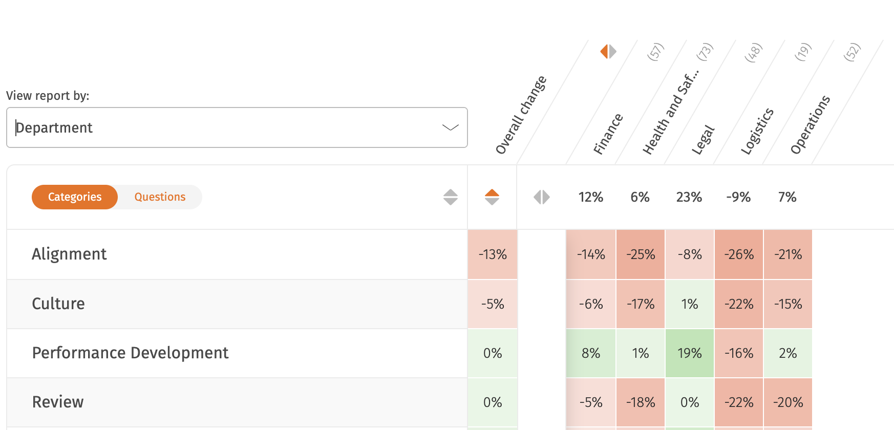This is similar to the Heatmap Report, except it shows how scores have changed between surveys for specific groups of people.